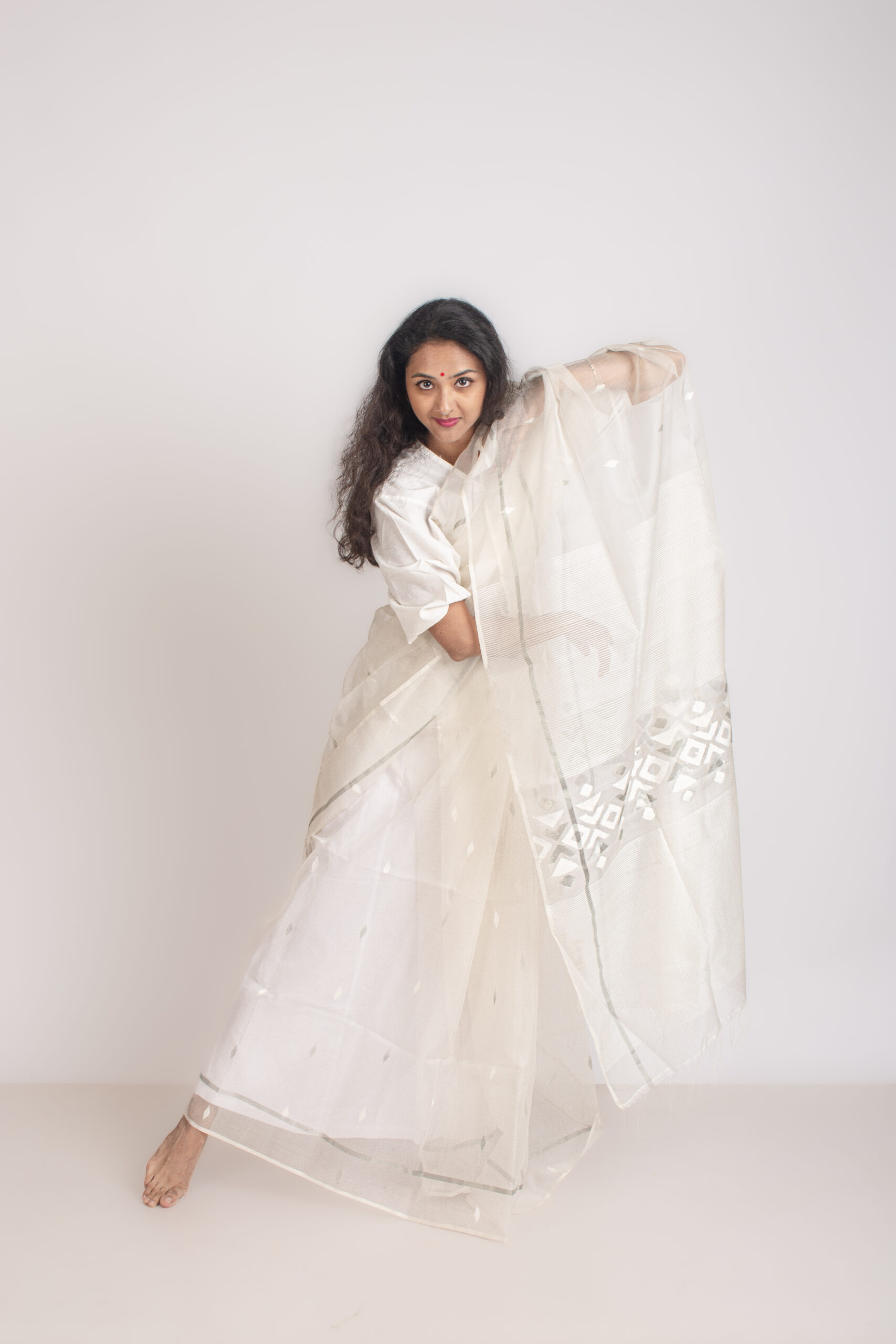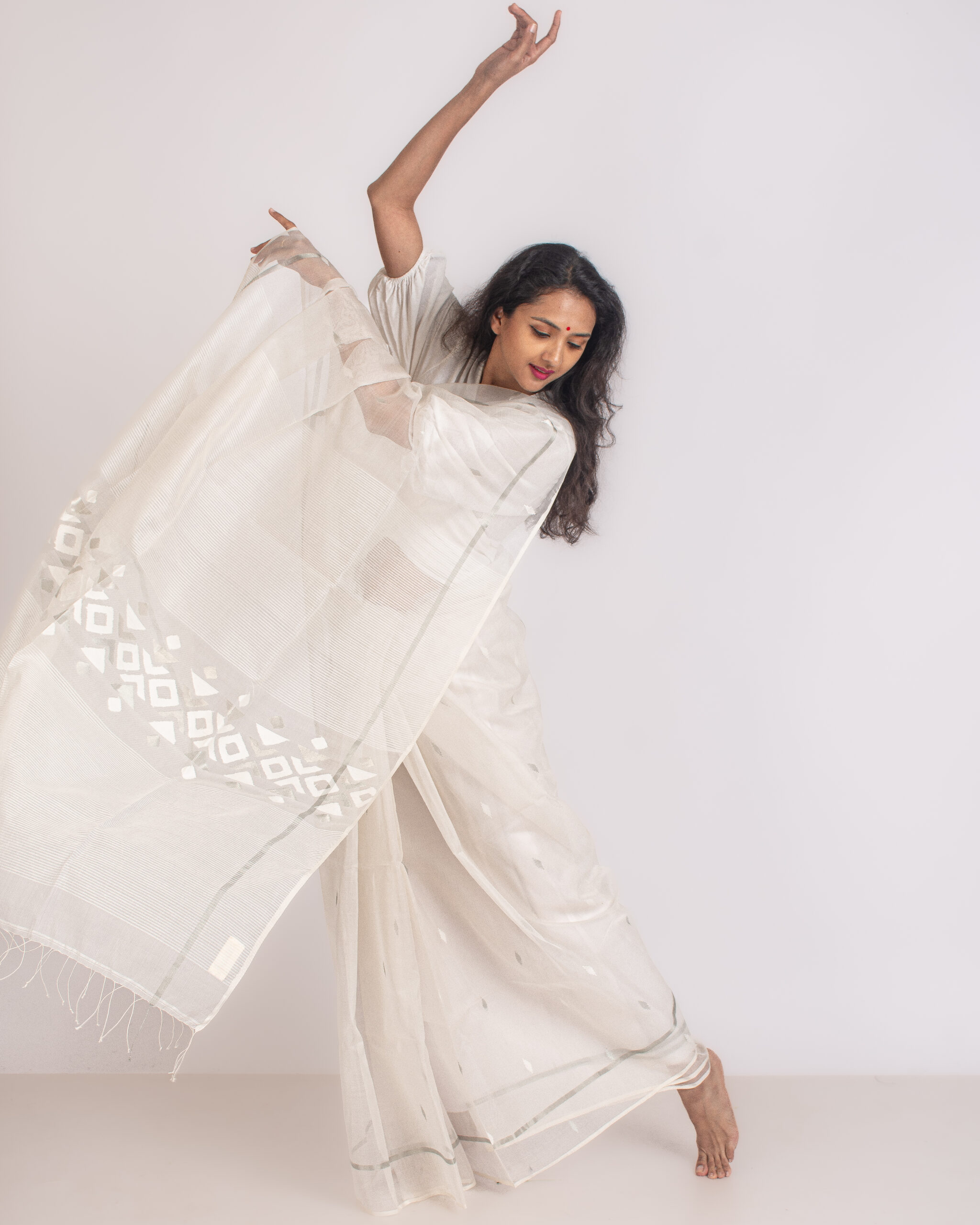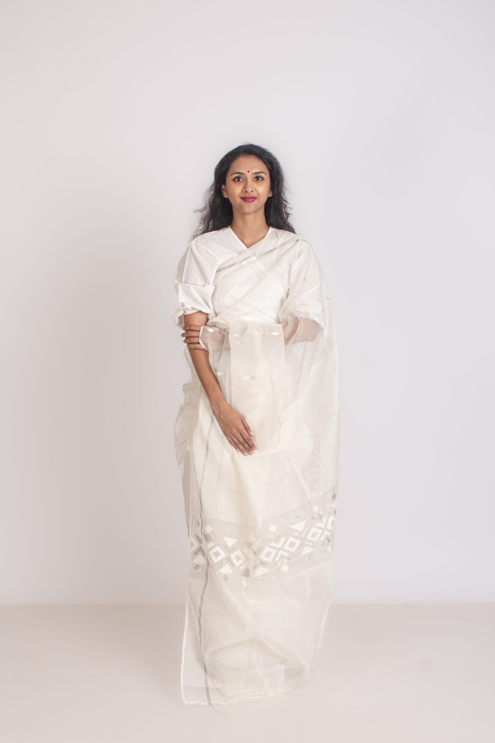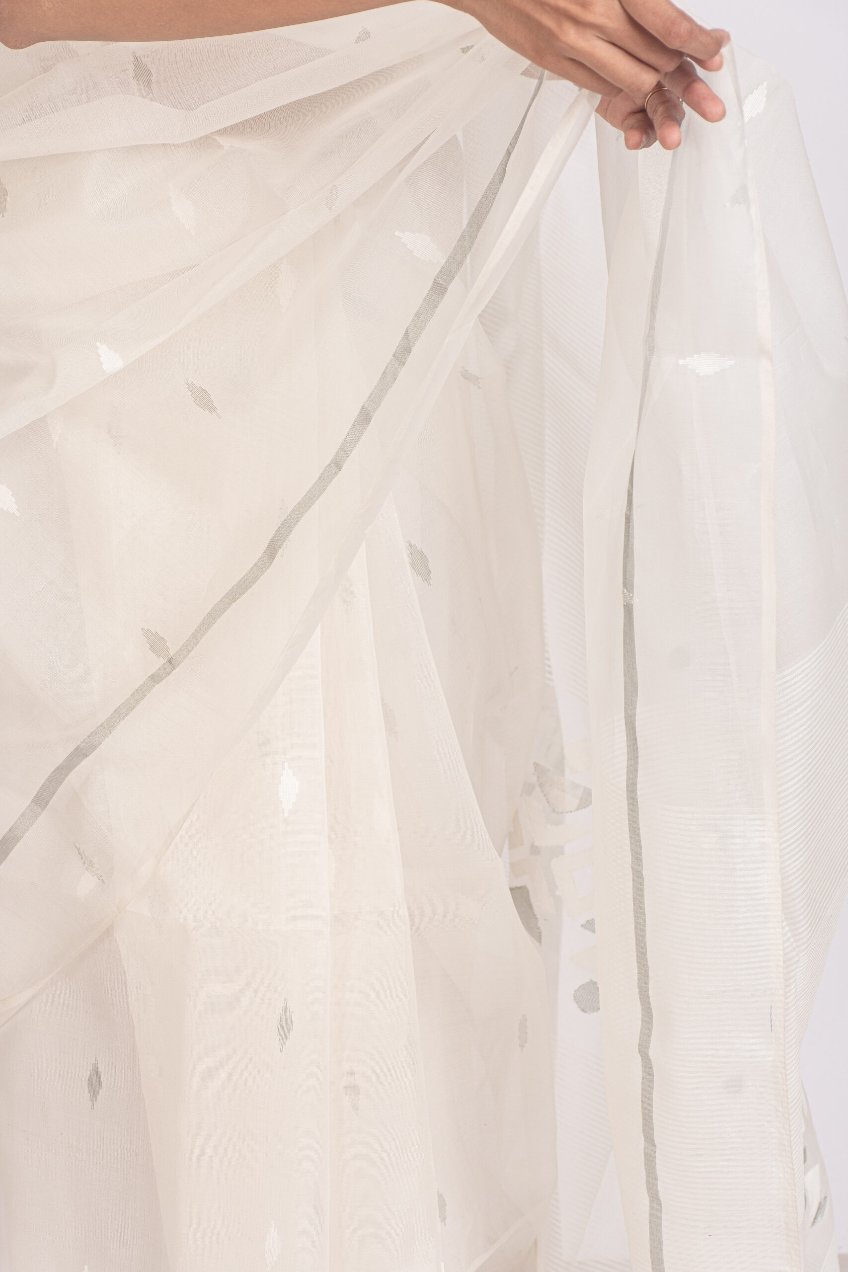 White resham silk handwoven jamdani saree with small motifs on the body