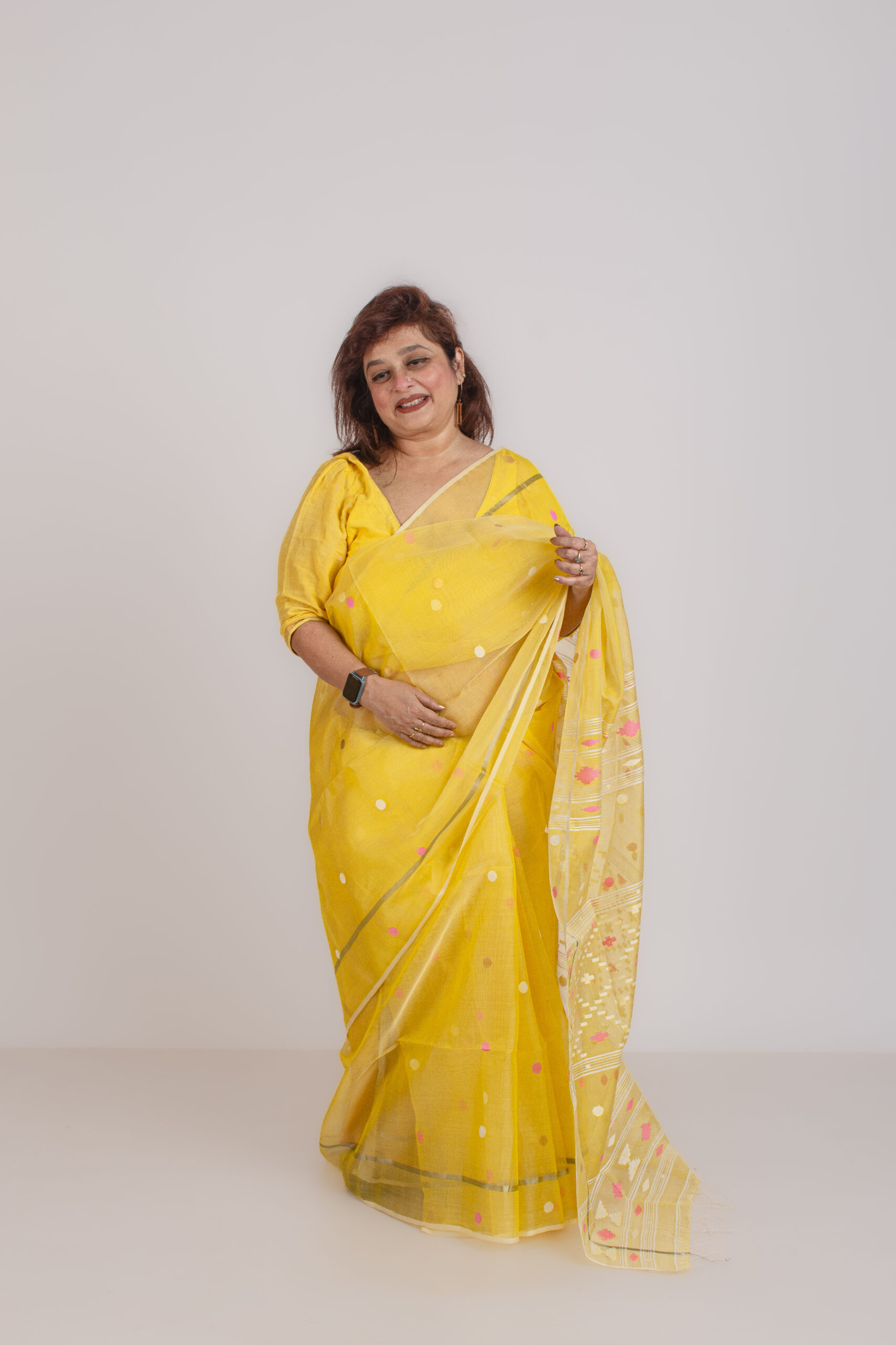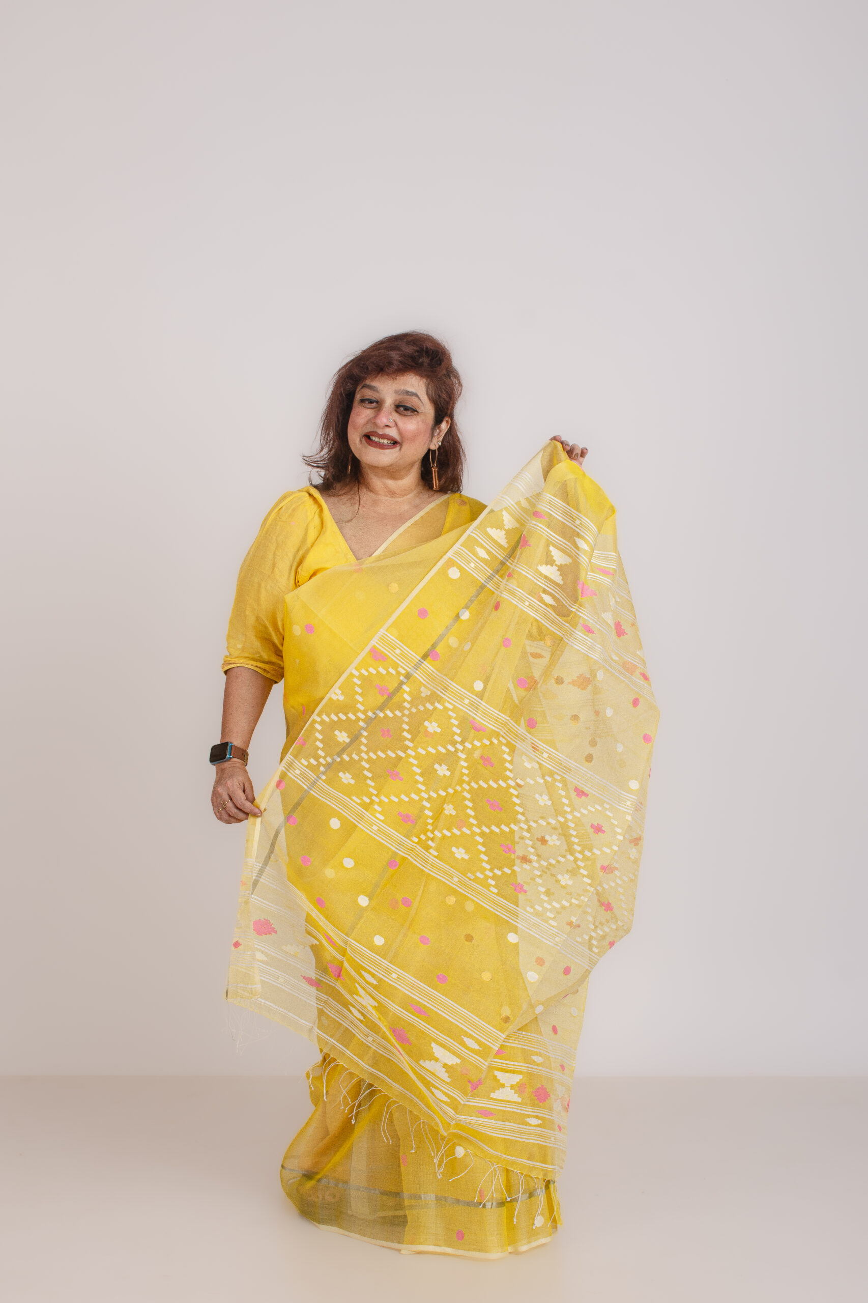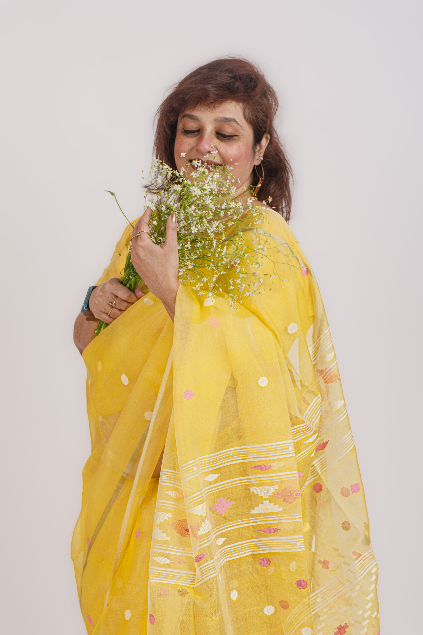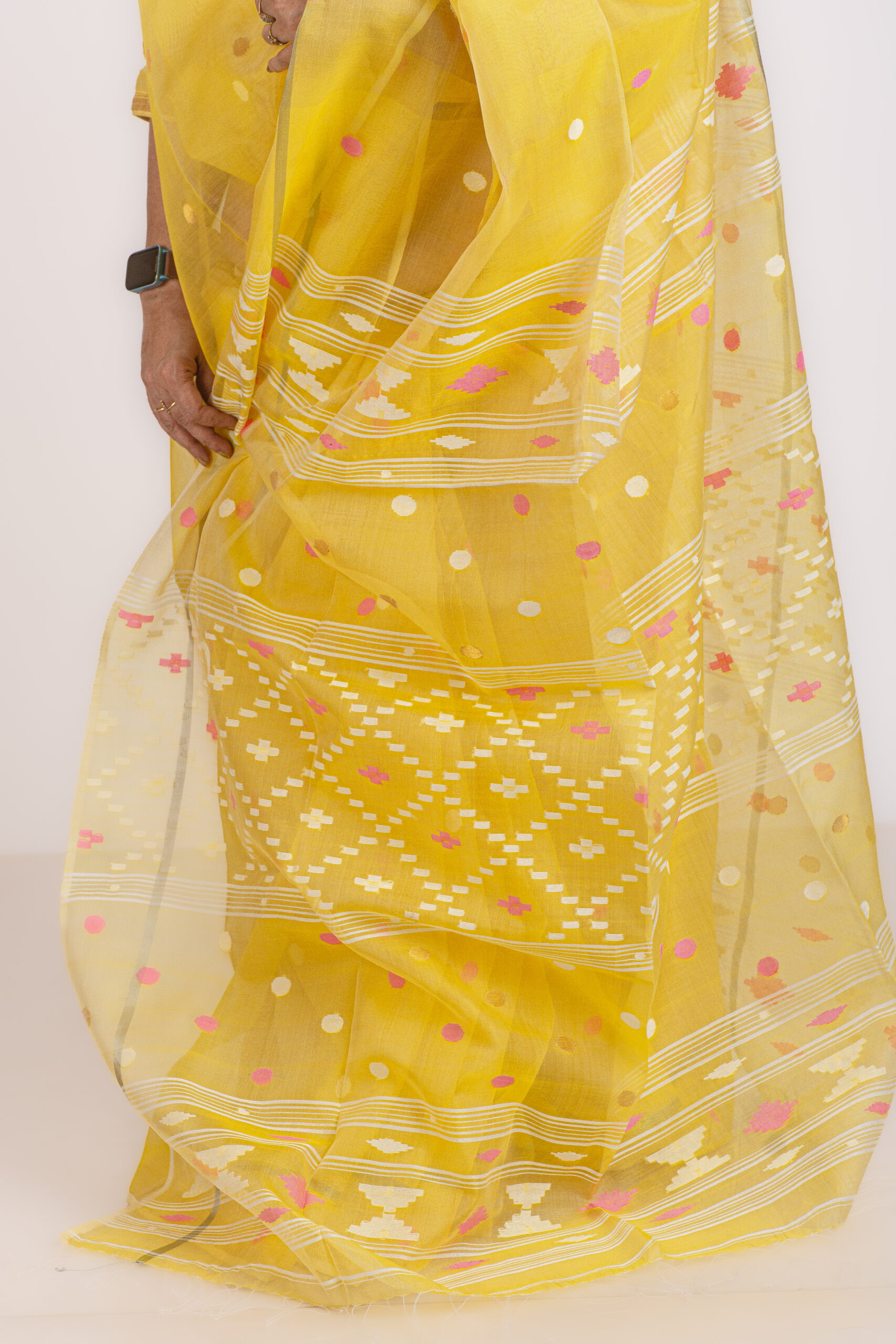 Handwoven resham silk yellow jamdani saree with traditional motifs